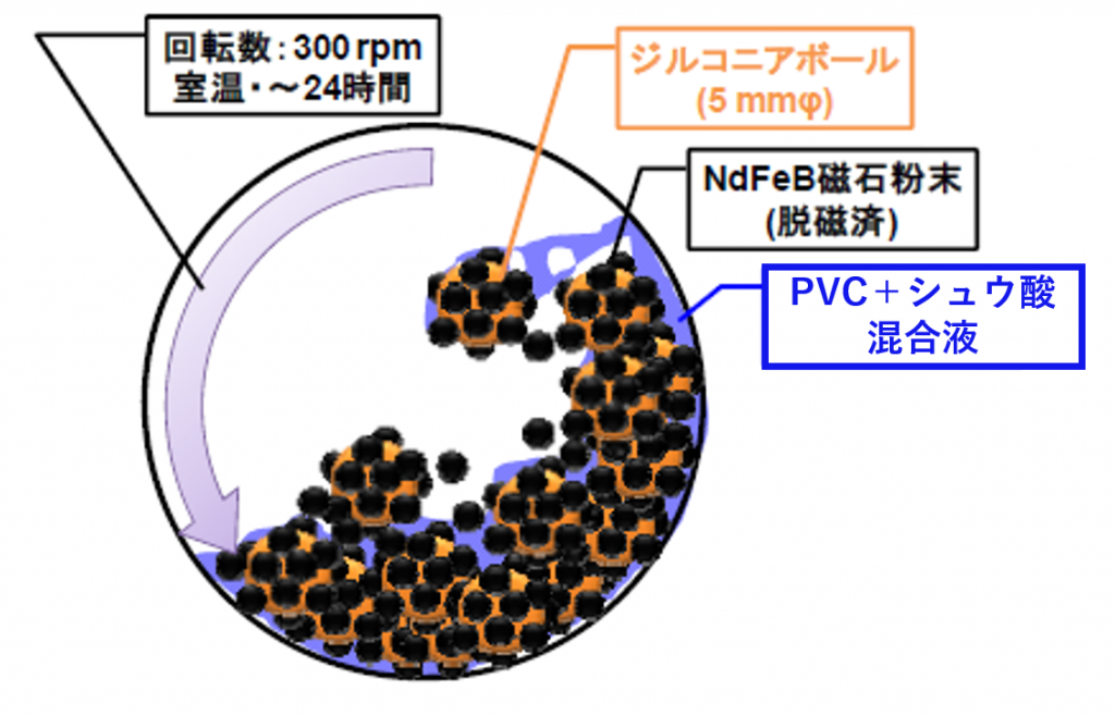 (以下、PVC)を用いた湿式メカノケミカル処理によるNd(ネオジム)磁石からの希土類金属回収の技術開発を進めています。